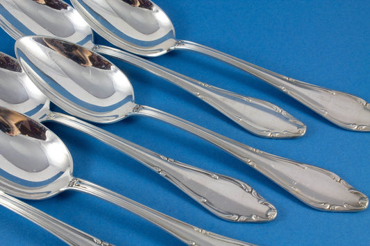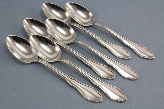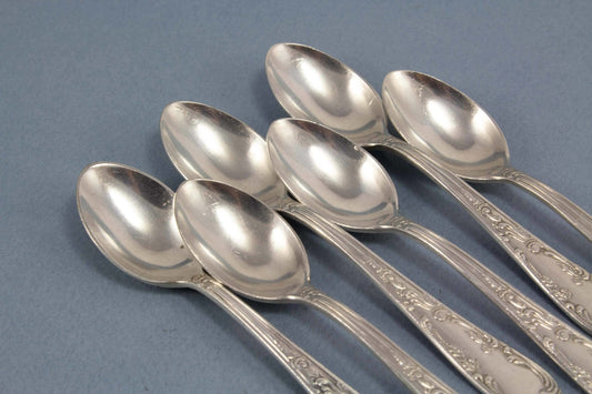 6 Mokkalöffel, versilberte Espresso- Löffel im Rokokodekor