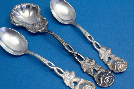 Kleines Besteckset, 2 Mokkalöffel und ein Zuckerlöffel mit einem eleganten Rosenmuster