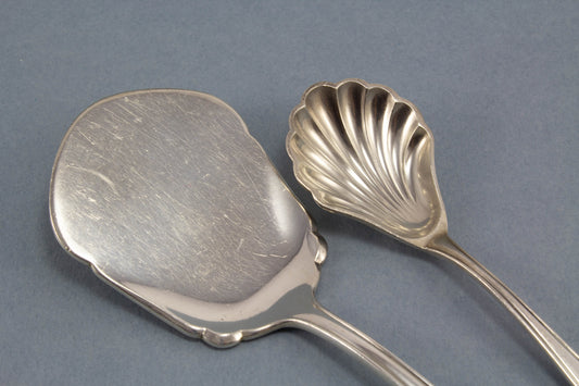 Servidor de repostería plateado con cuchara de azúcar, juego de cubiertos