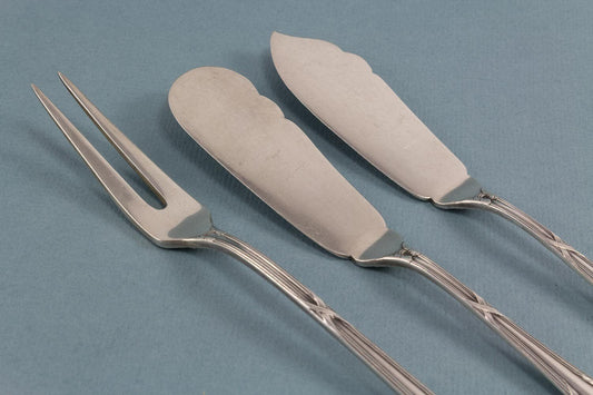 Cuchillo para queso, cuchillo y tenedor para mantequilla, Koch y Bergfeld, Art Nouveau, años 20