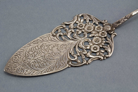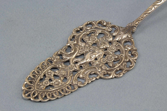 Pelle à gâteau à décor de roses et putti, pelle à pâtisserie en métal argenté avec ouvertures