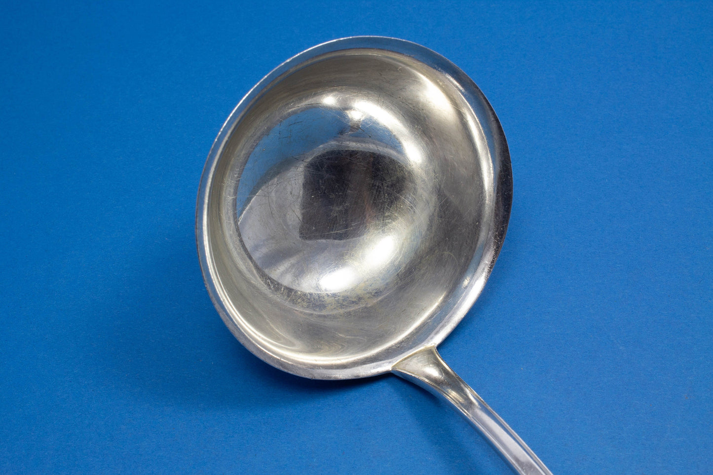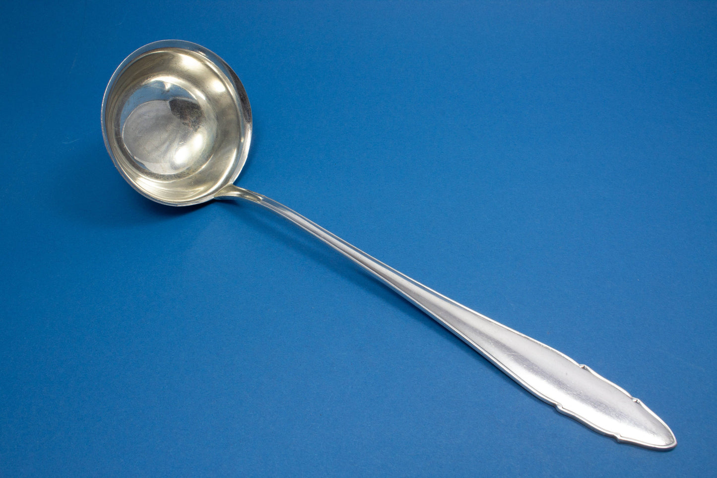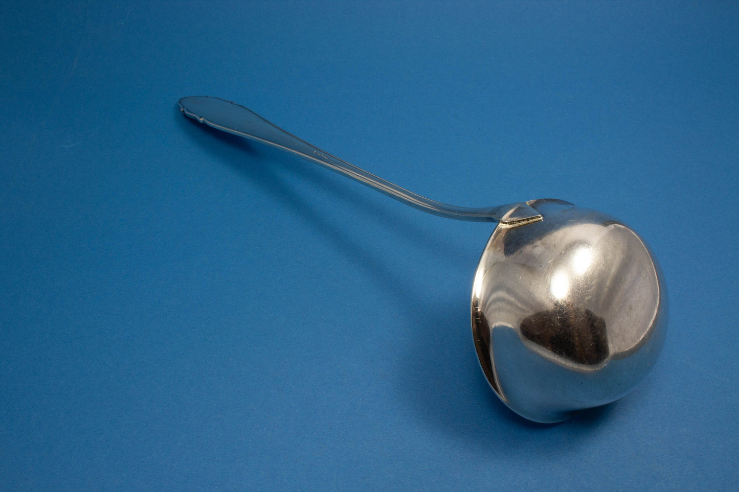 Cette louche à soupe plaquée argent présente un joli motif et est idéale pour les grandes marmites à soupe.