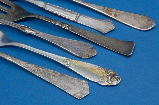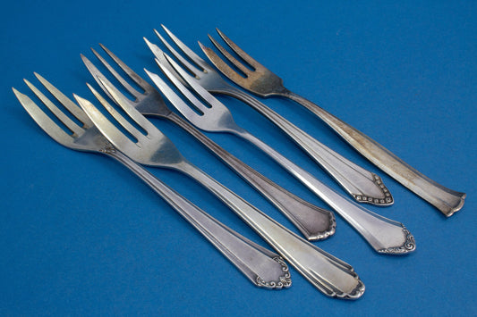 6つの銀メッキケーキフォーク、ミックスアンドマッチ、ミスマッチ、ぼろぼろのシック、フォーク