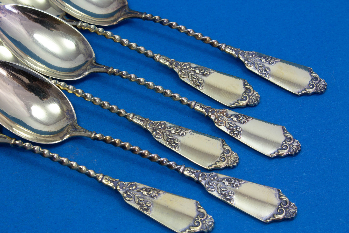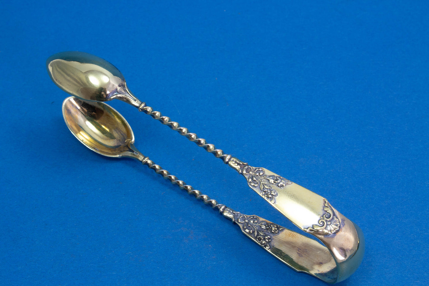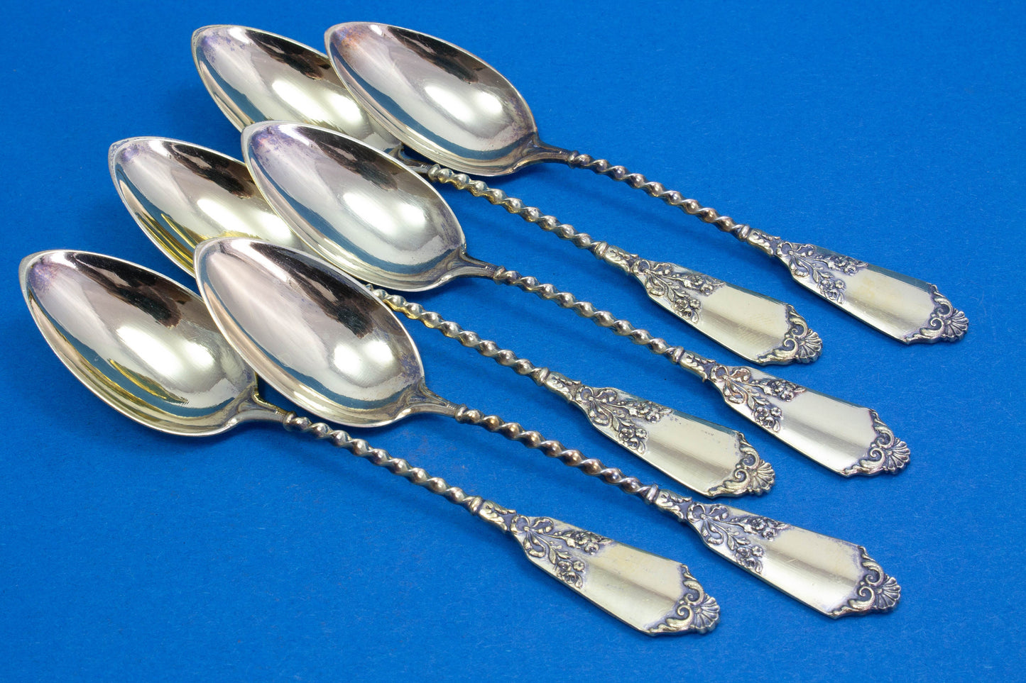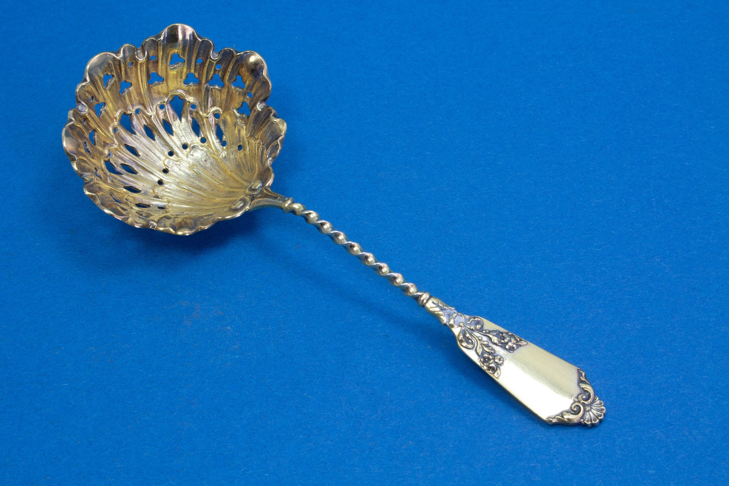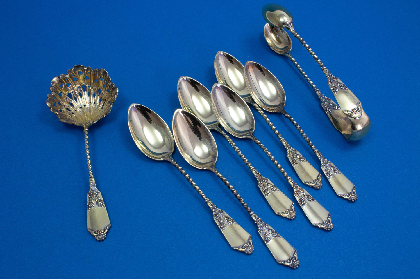 カトラリーは、フィリグリー スプーン 6 本、シュガー トング、茶漉しで構成されています。