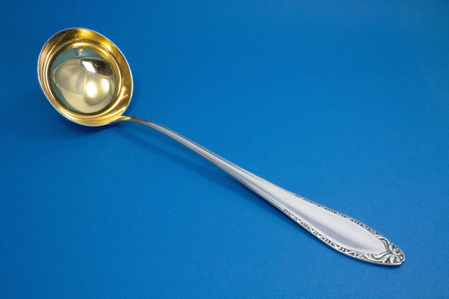 この銀メッキのスープおたまは、美しい模様が特徴で、大きなスープ鍋に最適です。