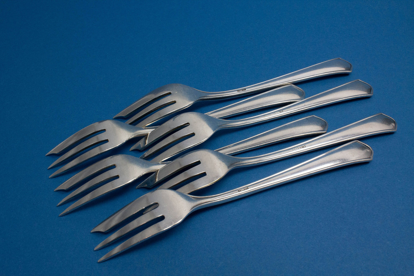 Sechs seltene Kuchengabeln aus der Besteckmanufaktur Bruckmann im Art Deco Dekor.
