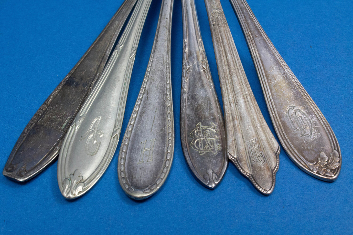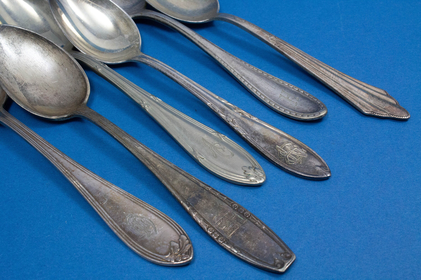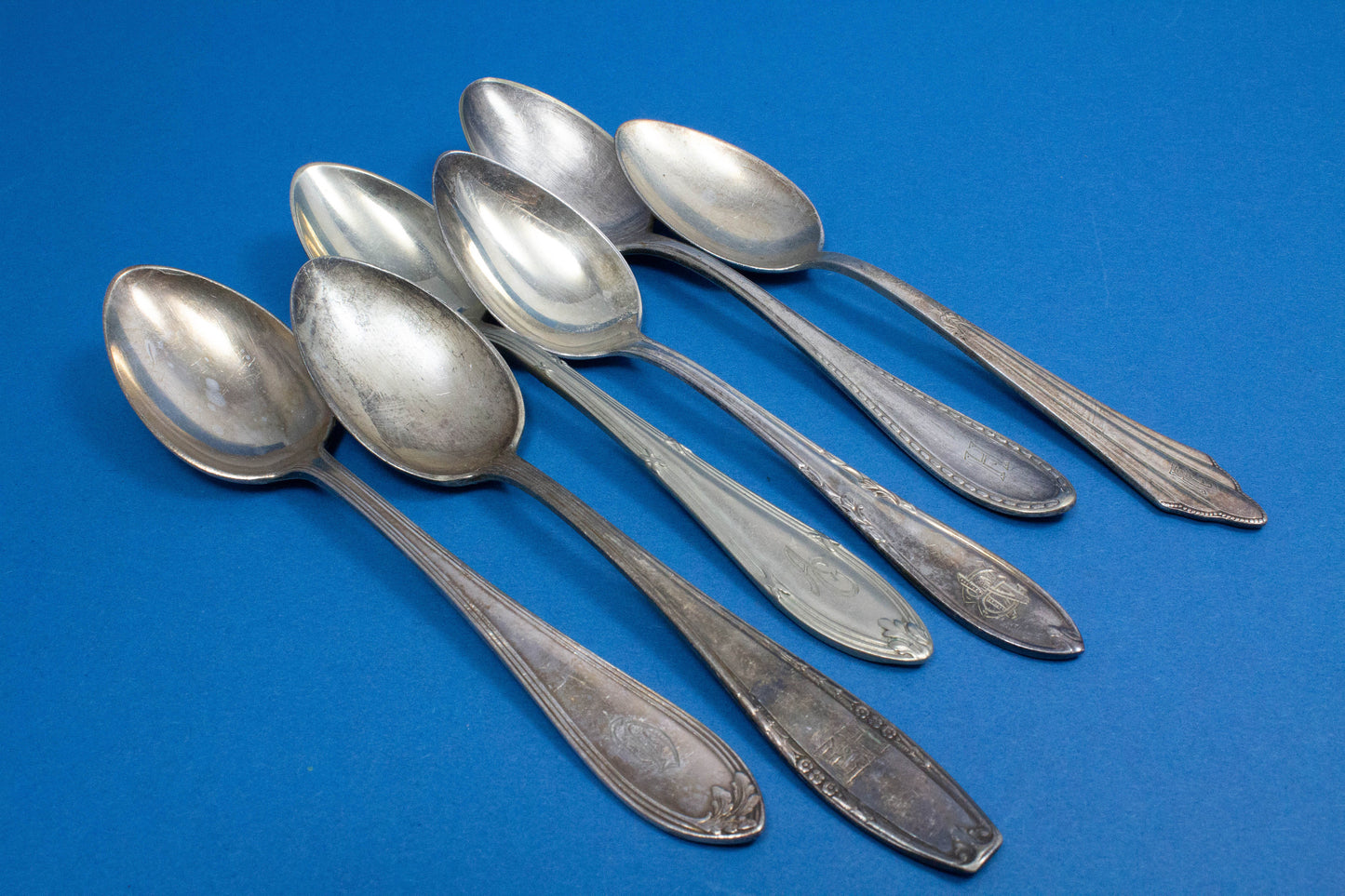 Sechs antike und versilberte Teelöffel mit verschiedenen, eindrucksvollen Dekoren des Jugendstils. Alle Löffel sind wunderschön mit Initialen graviert. Außergewöhnliche, uralte Löffel mit Charakter und teilweise ebenso alter Patina in verschiedenen Silberauflagen.