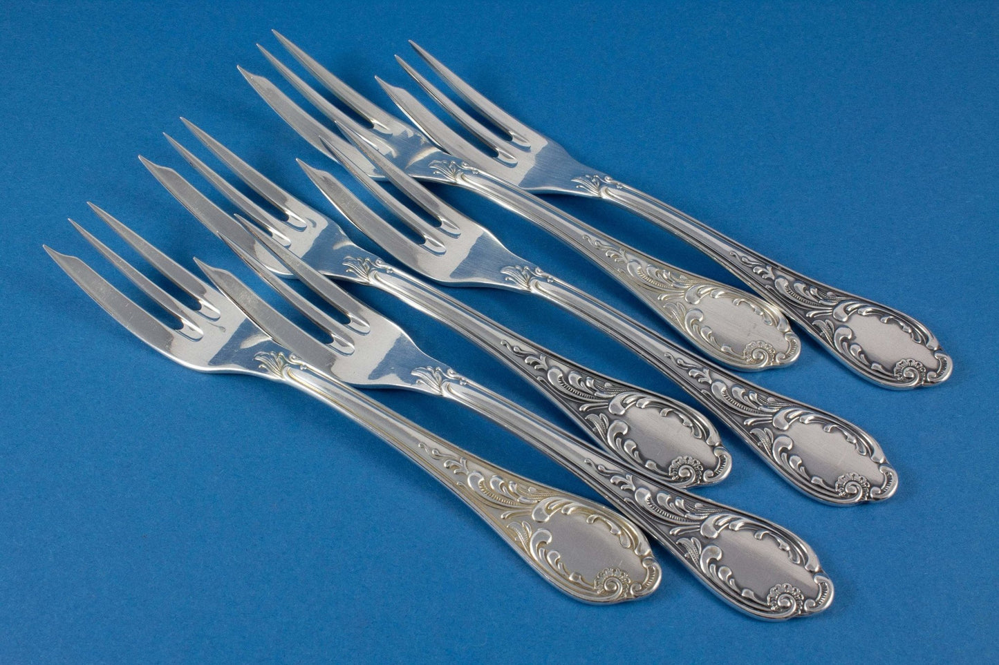 6 versilberte Kuchengabeln im Rokokostil