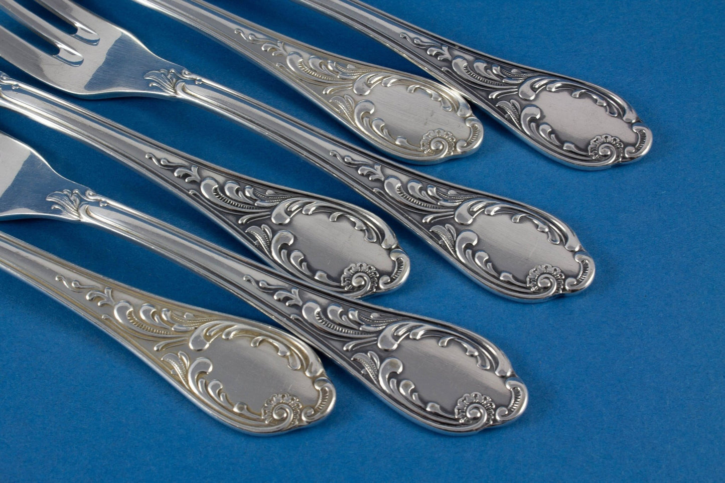Sechs versilberte Kuchengabeln im Rokoko-Stil. Wunderschöne Gabeln für besondere Momente.
